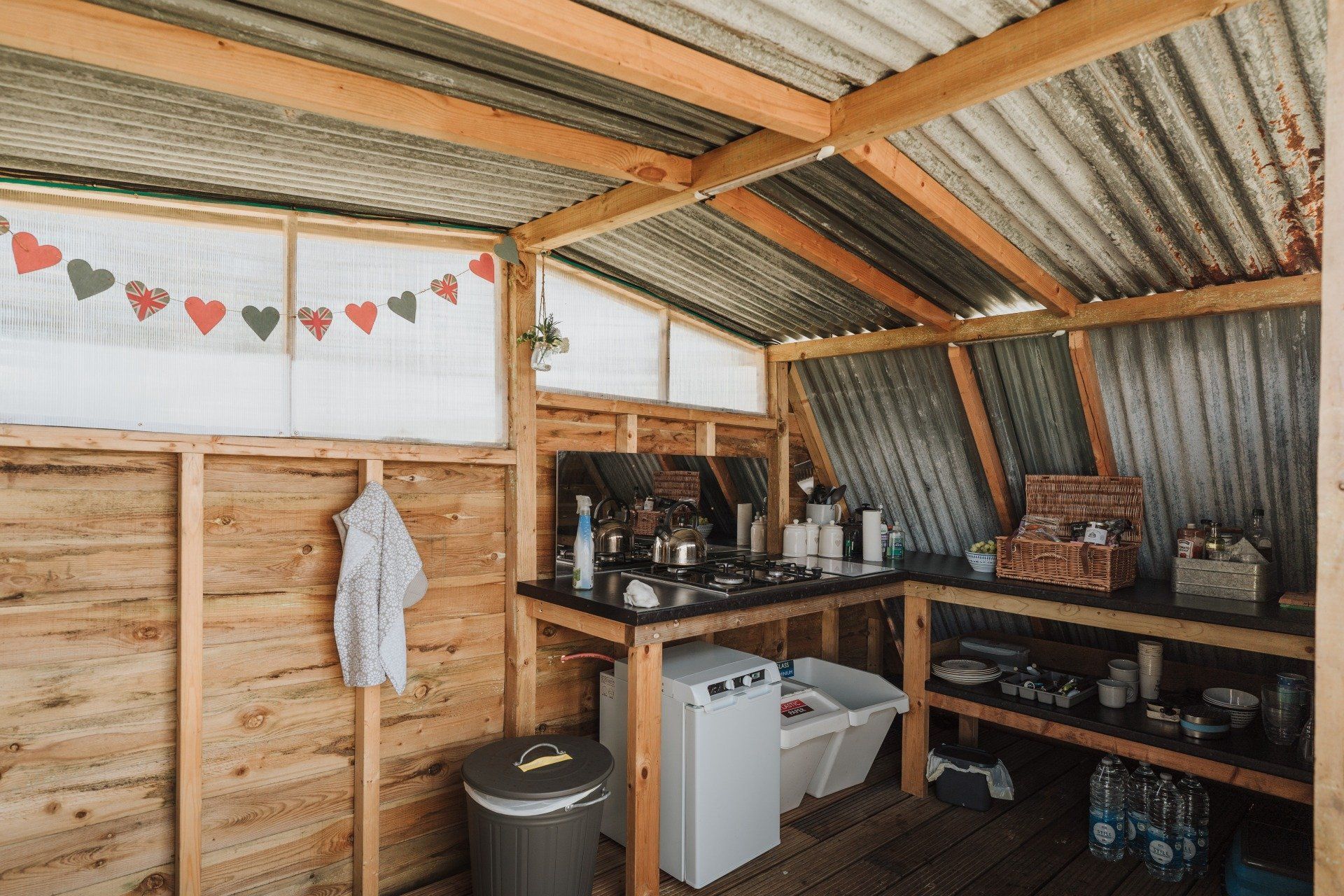 There is an outdoor cooking shelter with a gas hob, fridge, sink and an undercover dining area! A luxury hamper is also included featuring home made local produce and a bottle of champagne