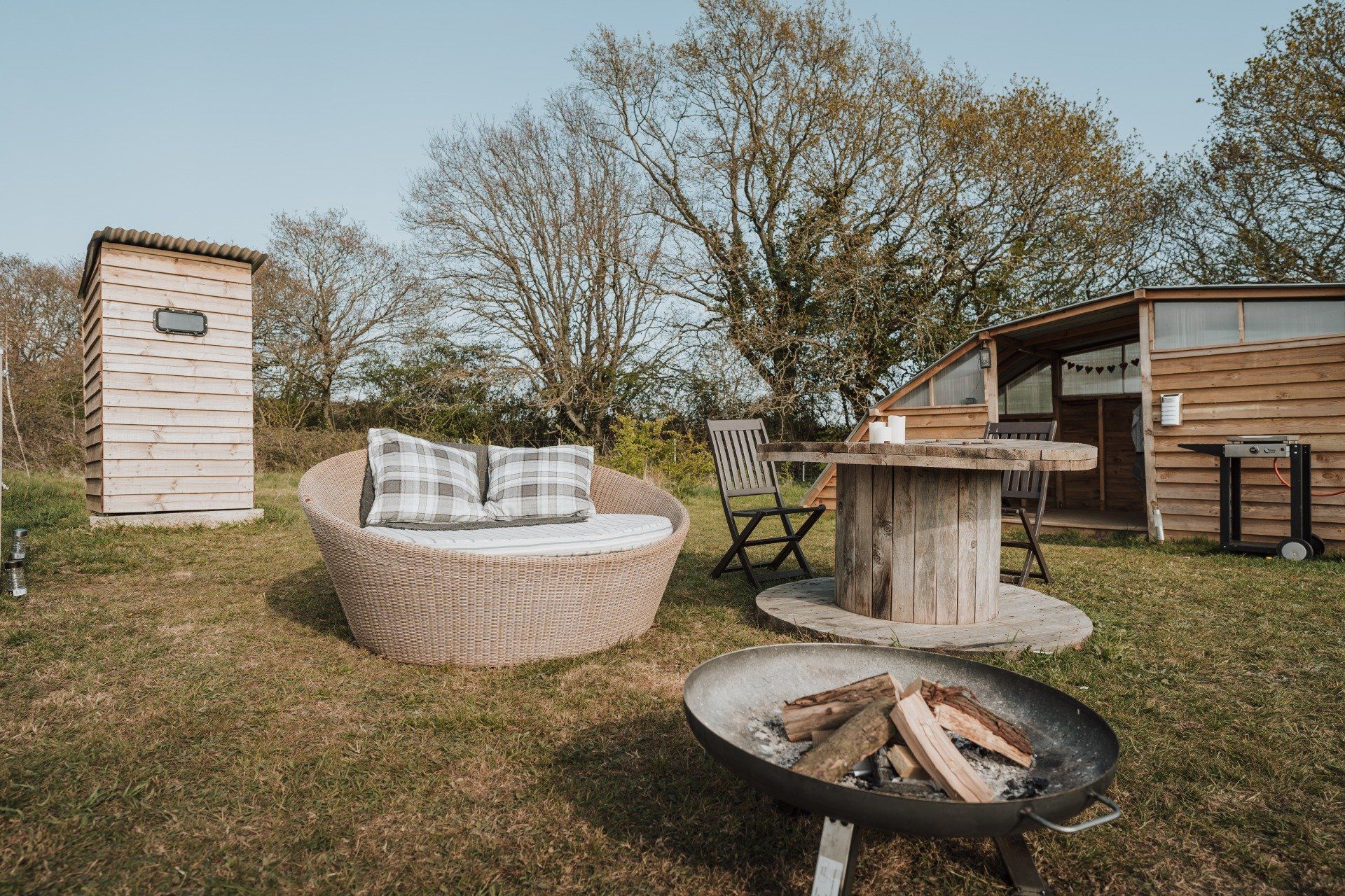 There is an outdoor cooking shelter with a gas hob, fridge, sink and an undercover dining area! A luxury hamper is also included featuring home made local produce and a bottle of champagne